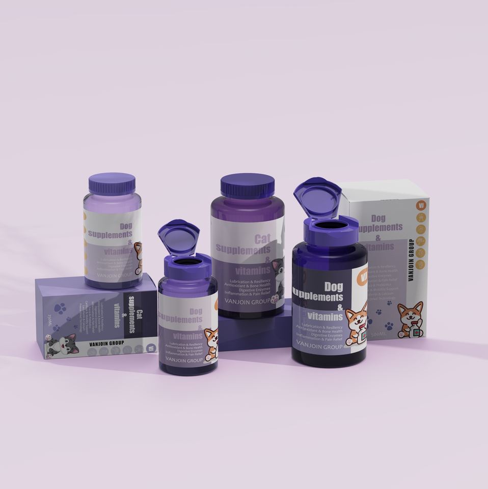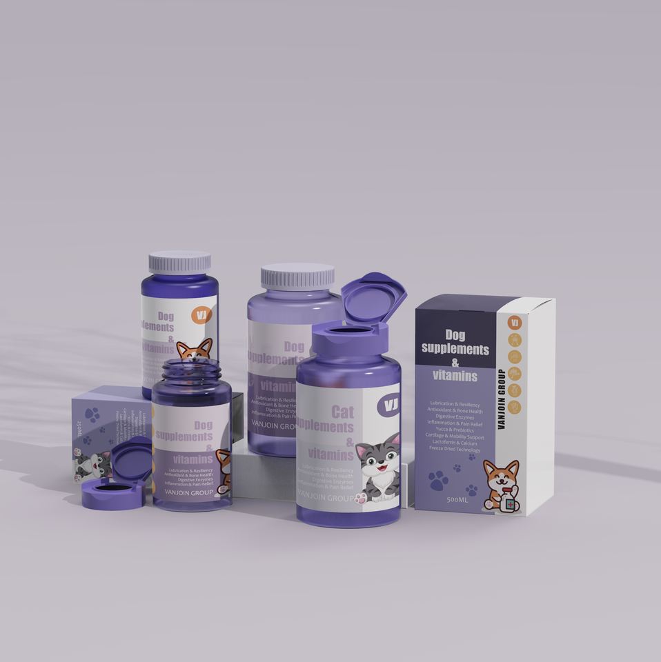 Nouvelle conception de flacon de complément alimentaire pour animaux de compagnie en plastique HDPE pour chiens et chats, vitamines, étiquette anti-poussière, impression d'étiquettes, 250ML500ML