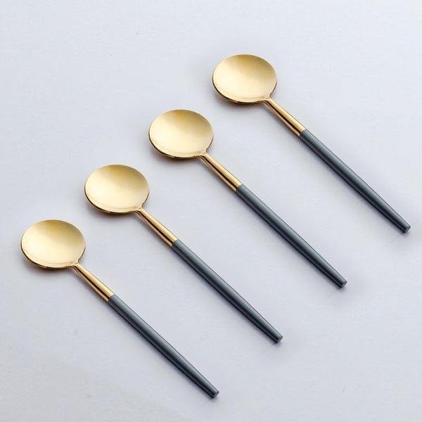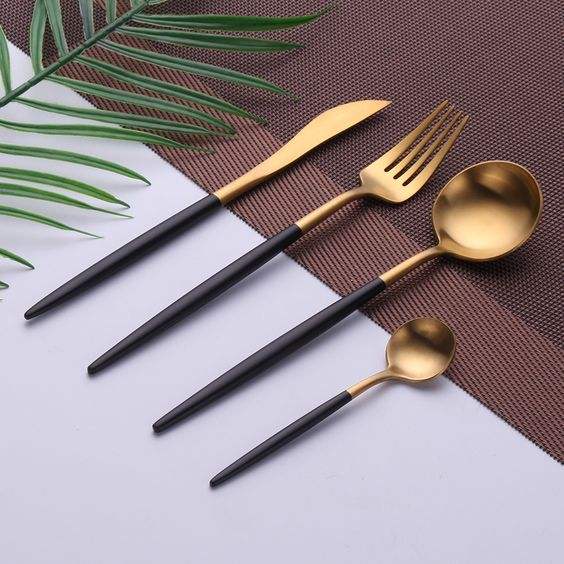 Services de couverts en métal de style européen et services de couverts en métal inoxydable pour les fêtes, services de couverts en or mat pour les mariages et la location