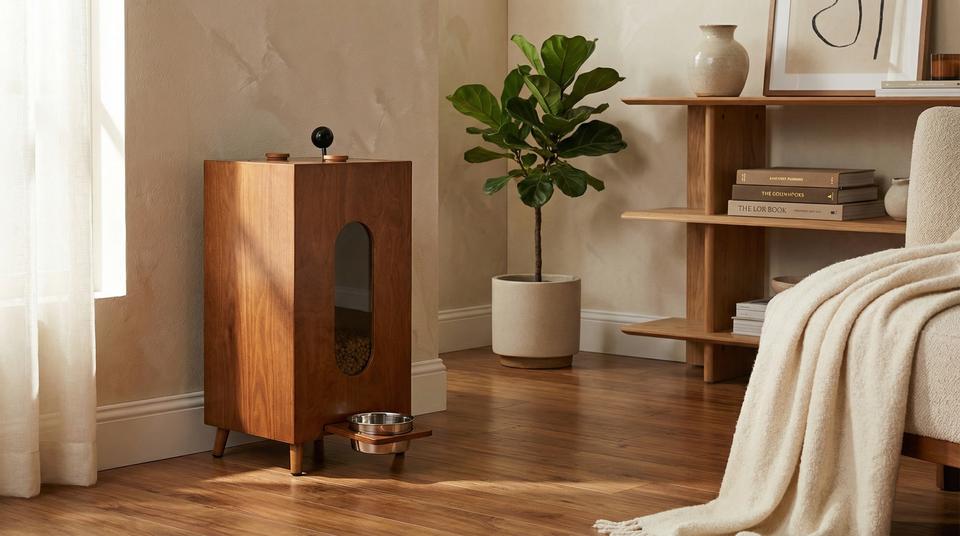 Nouvelle conception | Bac à nourriture pour animaux de compagnie en bois massif avec distributeur manuel | Distributeur de nourriture pour chiens et chats de grande capacité pour la maison moderne