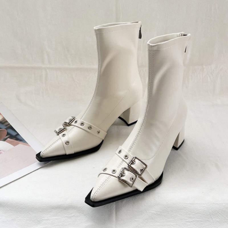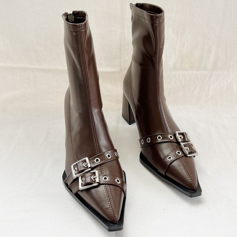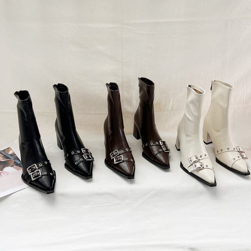 New Design Splicing Belt Buckle Woman Ankle Boots Street Style Thin High Heels Pointed Toe Banquet Prom Shoes