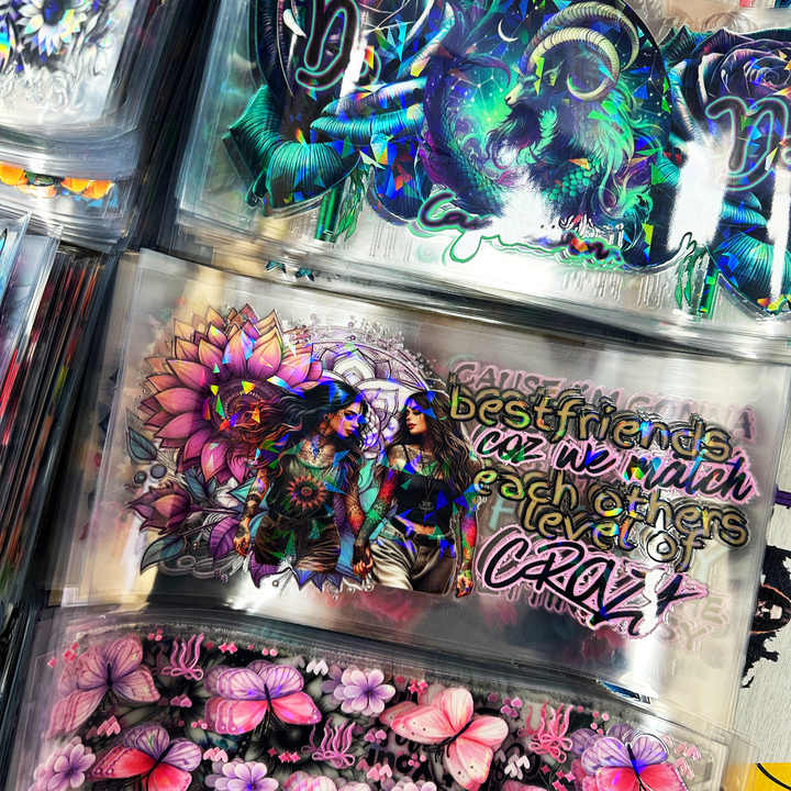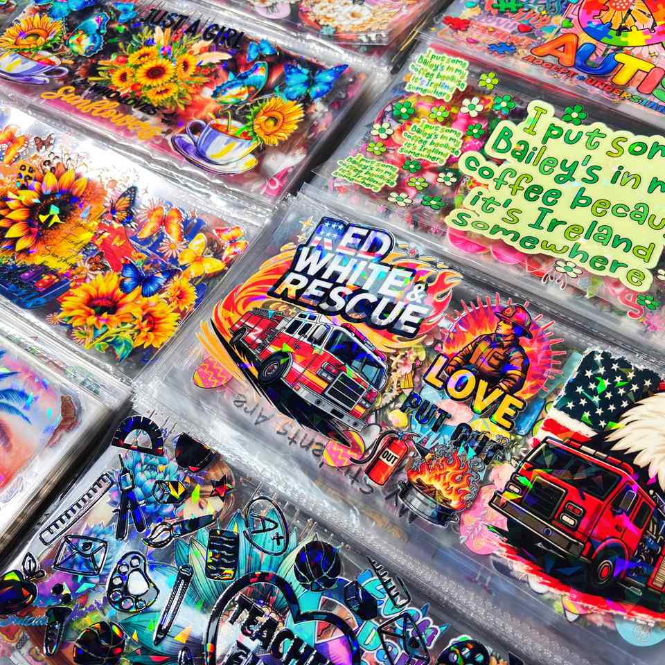 Nouvelles autocollants holographiques UV de style design pour loisirs créatifs et habillage de tasses, transferts UV DTF pour la vente en gros aux entreprises, prêts à presser