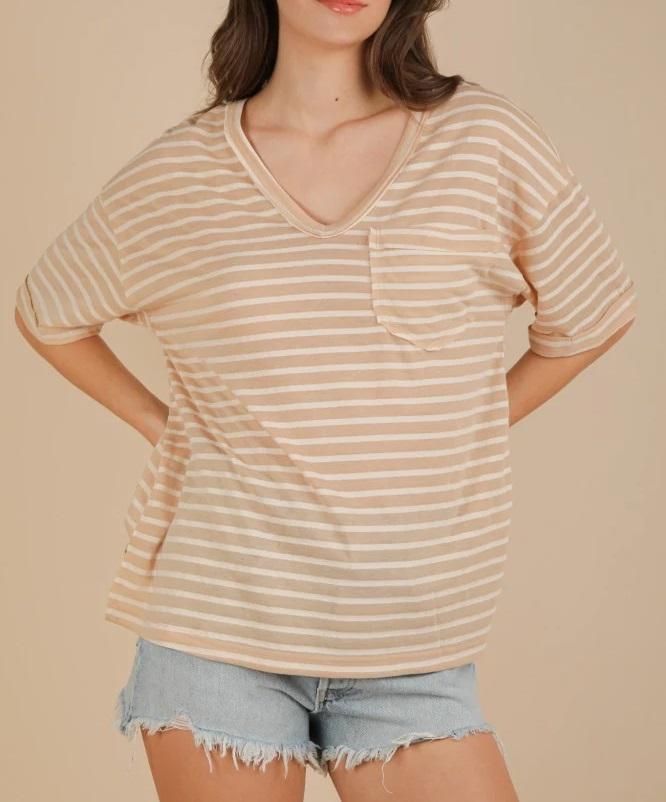 Nouveau design T-shirt de maternité à col en V rayé, coupe oversize et épaules tombantes, respirant, 100% coton, pour la grossesse