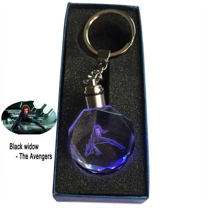 Nouvelle conception de la série Vengers Marvel, porte-clés en cristal transparent en forme d'octogone avec lumière LED, Scarlett Johansson Black Widow, laser 3D