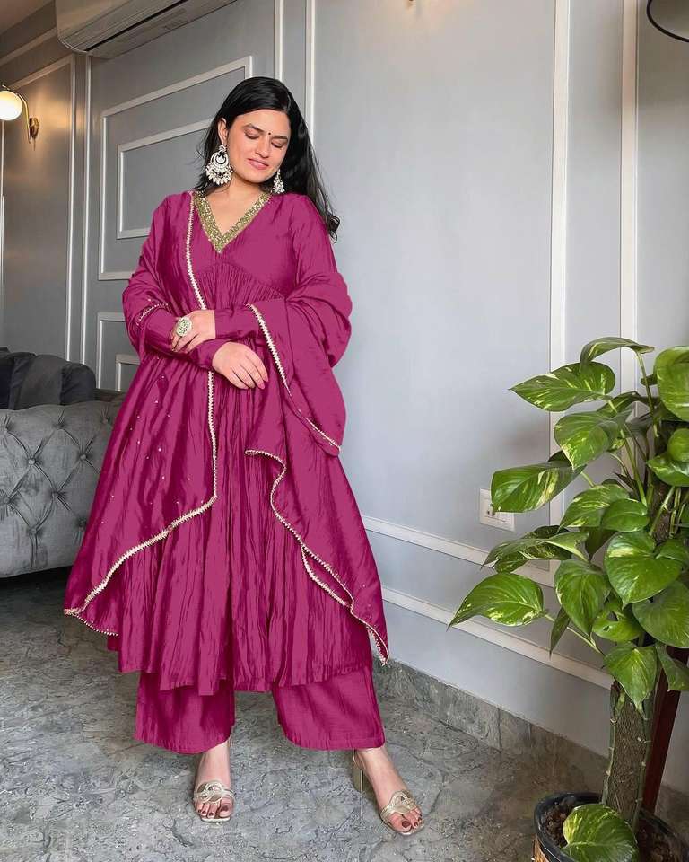 Nom du produit:Ensemble robe en soie Chinon, bas et dupatta