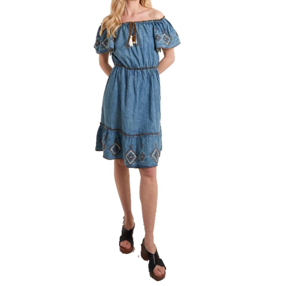 Nouvelle robe courte en jean brodée à épaules dénudées pour femme, style bohème à manches courtes évasées et volants