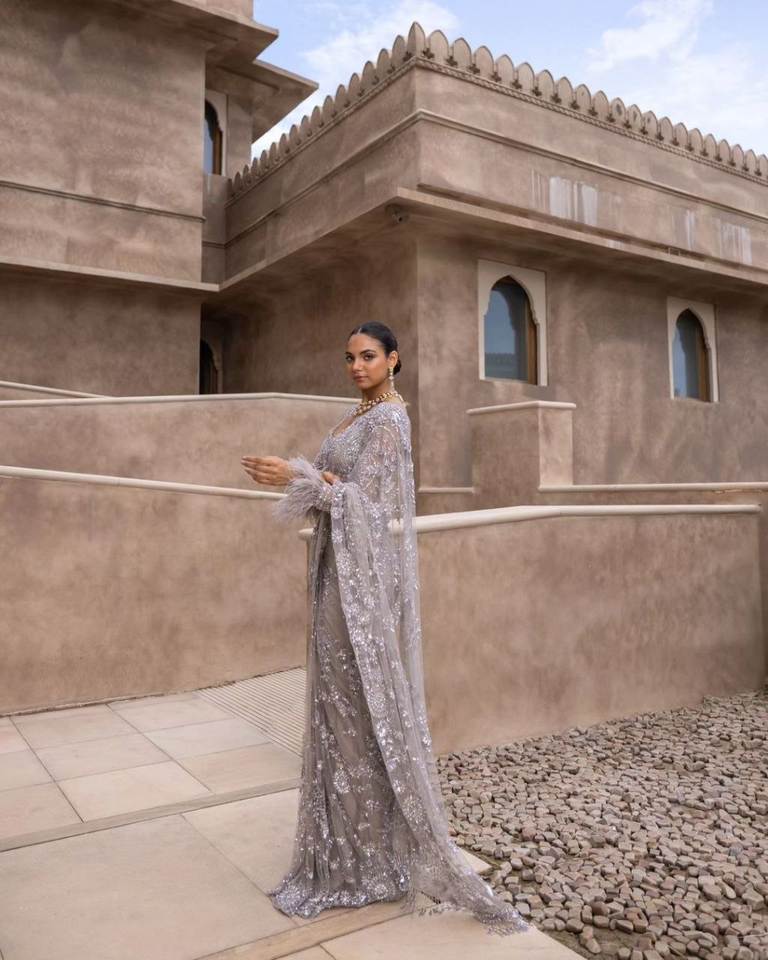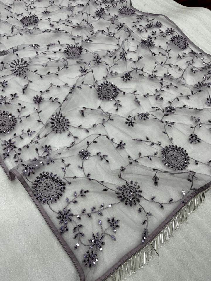Sari en Georgette de Créateur avec Broderie, Paillettes et Volants, Entièrement Cousu pour les Mariages et les Fêtes Indiennes