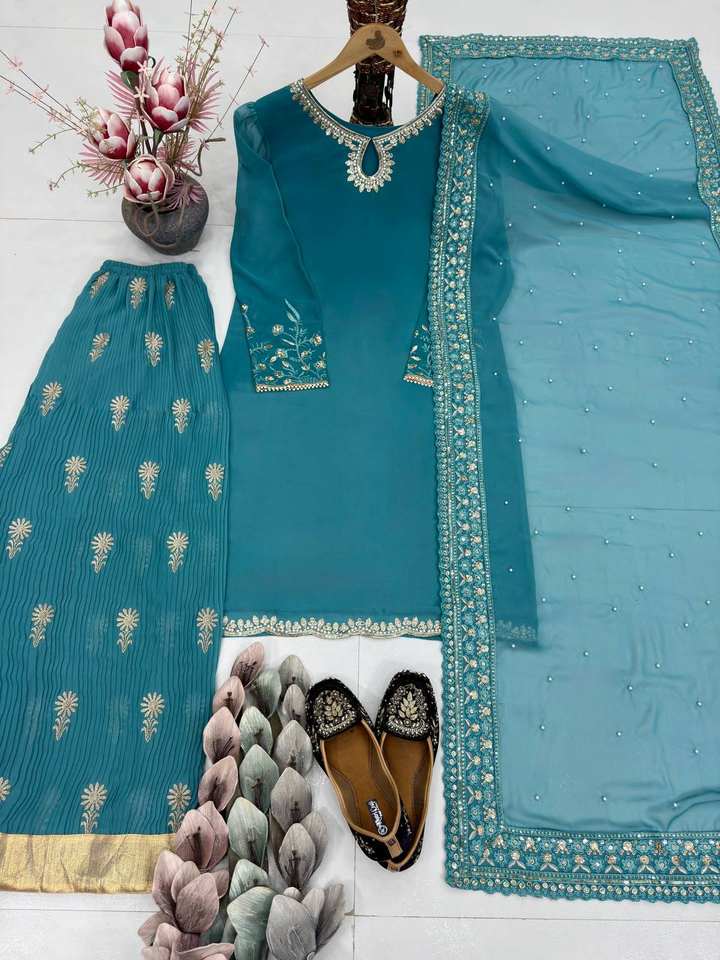 Nouvel ensemble de costume Sharara en Georgette Faux de créateur, lourd et orné de broderies et de sequins