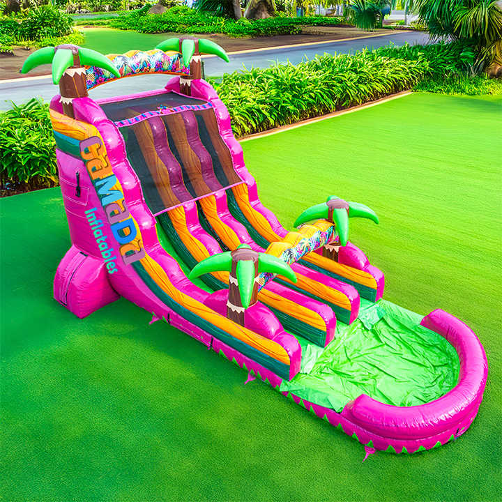 Nouveau château aquatique gonflable à double toboggan, couleur fruit du dragon, avec palmier et piscine pour jeux d'été en extérieur dans la cour