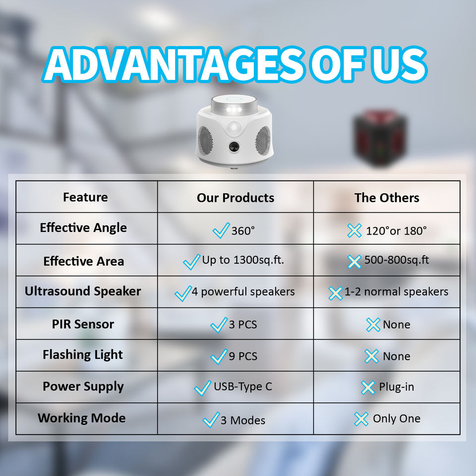 Avantage:Avec 4 haut-parleurs ultrasoniques et 9 lumières clignotantes et 3 PIR Sendsor