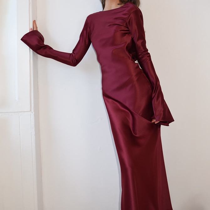 Nouvelle Robe Longue Femme Élégante et Raffinée, Couleur Unie, Dos Nu, en Satin Respirant Non Tissé, Longueur Ras du Sol, Fente Haute, Manches Évasées