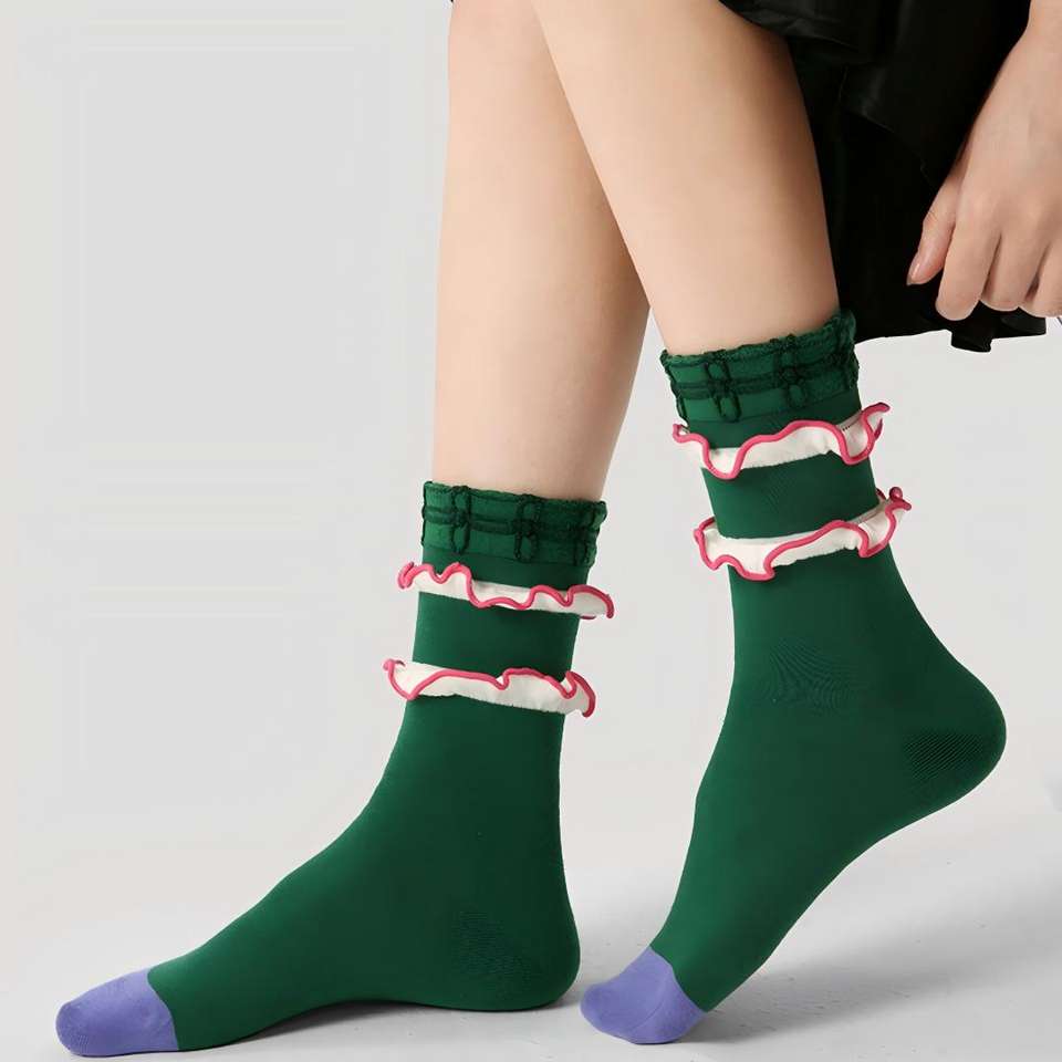 Nouvelles chaussettes pour femmes vert émeraude à double volant, bordure rose, bout contrastant violet, chaussettes vintage extensibles et anti-humidité