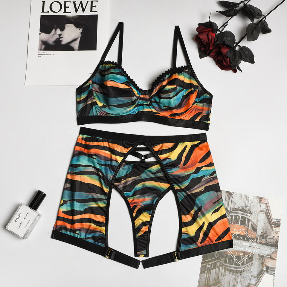 Nouvel ensemble de lingerie érotique à rayures multicolores, ensemble de soutien-gorge sexy en trois pièces pour la plage en plein air