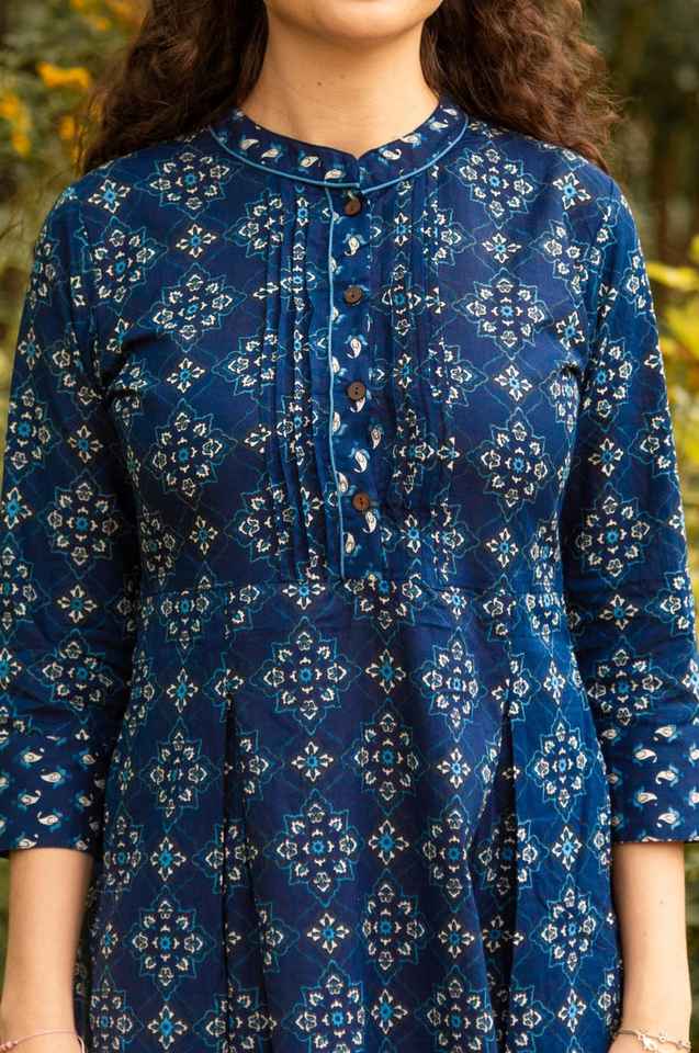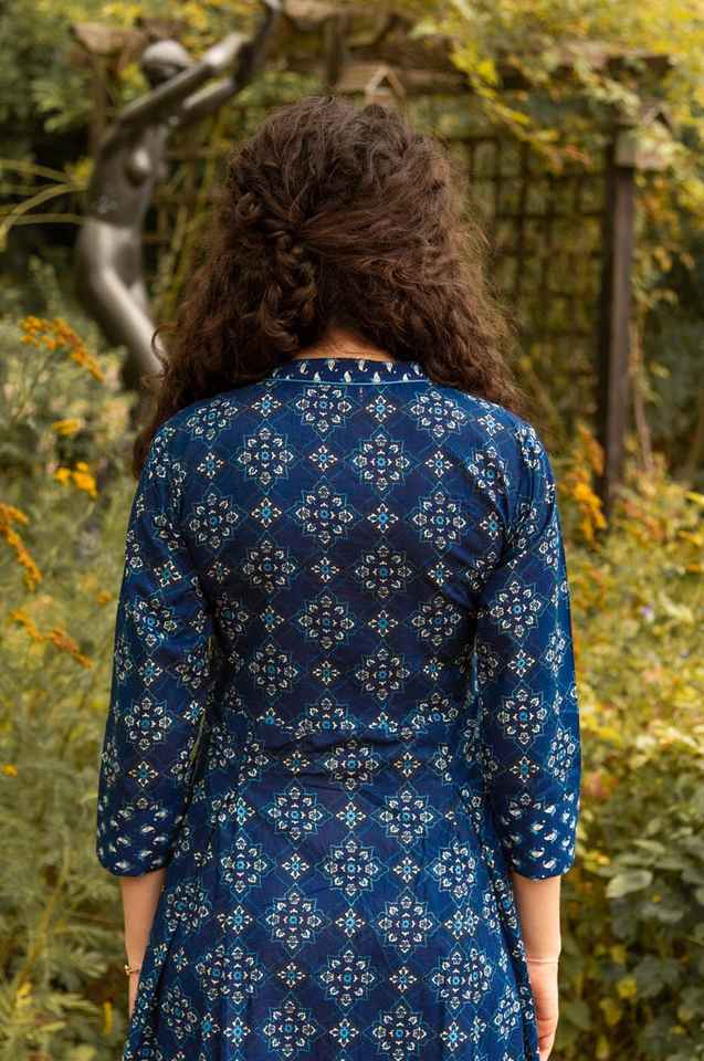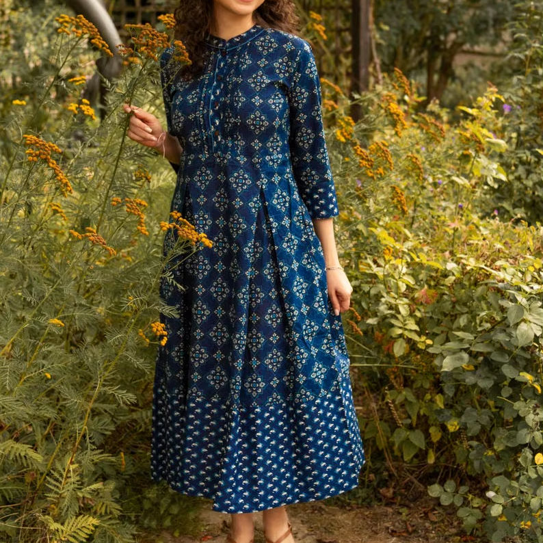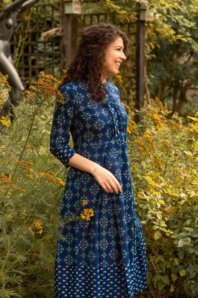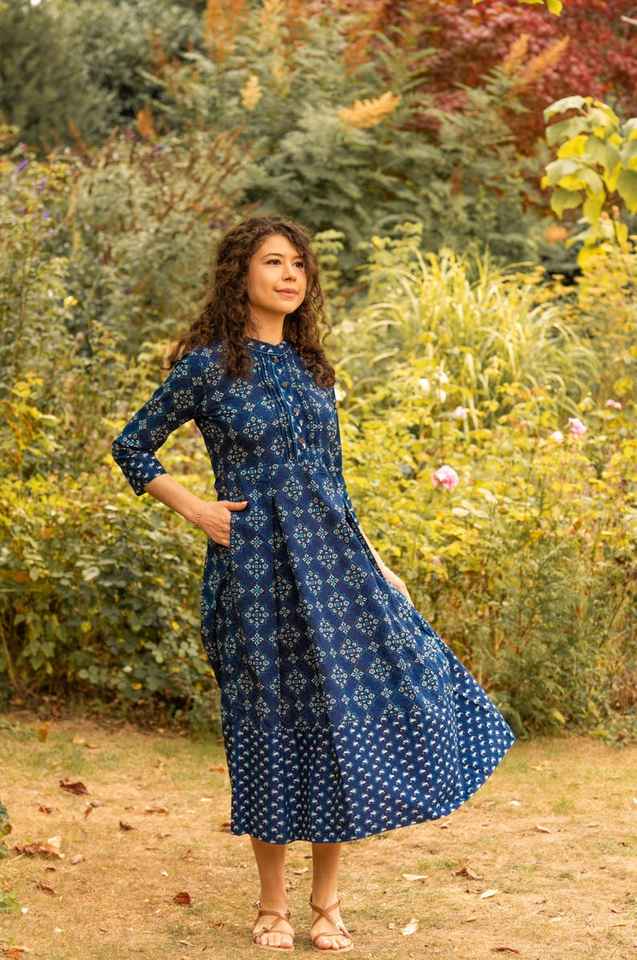 New Estelle Dress Pure Cotton Hand Block Printed A Line Calf Length Bohemian Blue White Summer Holiday Handmade Ethical Fashion