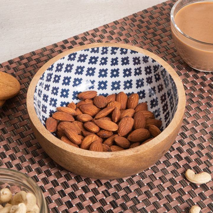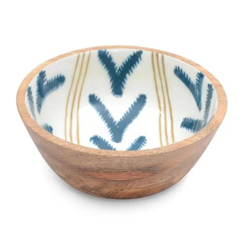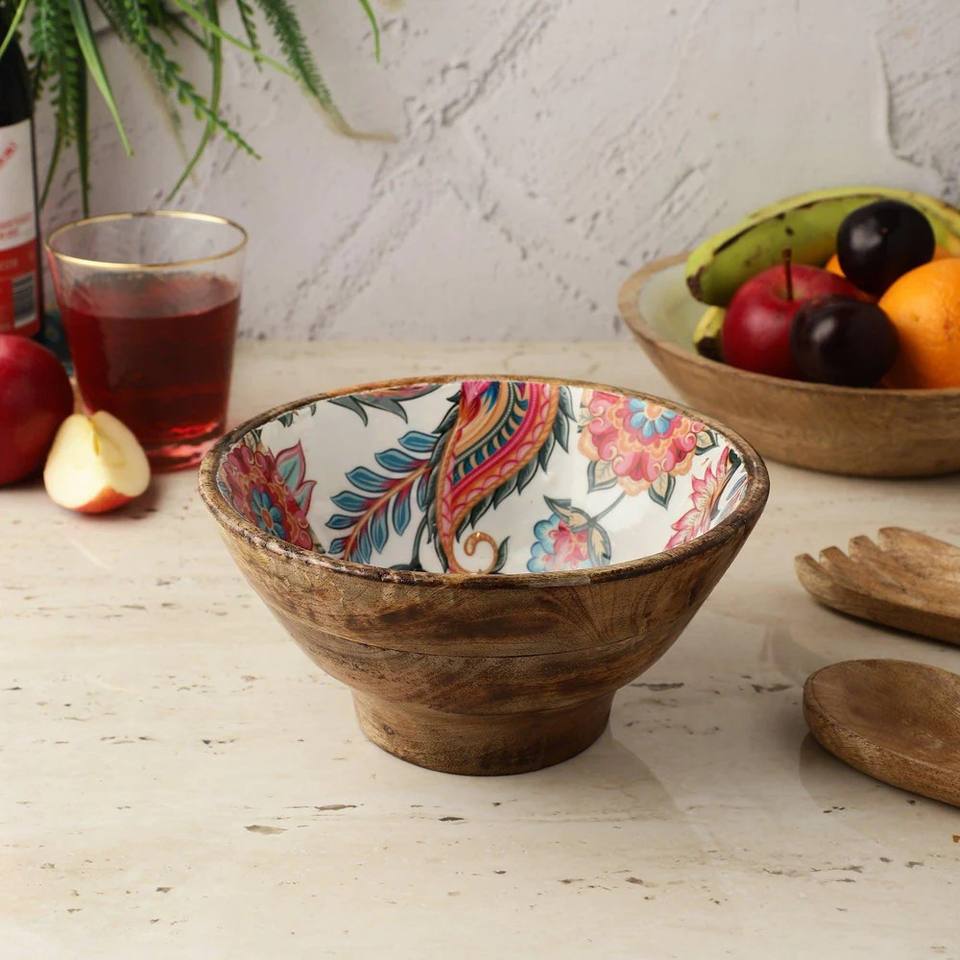 Nouvelle exportation de haute qualité autocollant émail imprimé manguier bois bol rond pour usage polyvalent table et ustensiles de cuisine décor à la maison