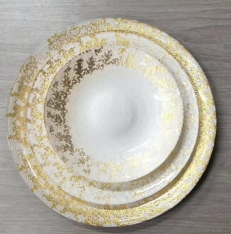 Nom du produit:Assiettes de présentation en verre à bordure or rose, design strié
