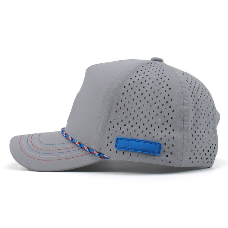 Casquette de sport en polyester imperméable à 5 panneaux avec logo personnalisé en PVC tendance, découpe au laser perforée, casquette de baseball avec cordon