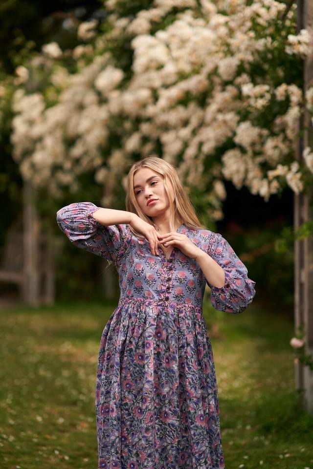 New Florie Bohemian Mini Velvet Dress Hand Block Printed Floral Dress Blue Rose Casual Handmade Natural Waist Ethical Fashion