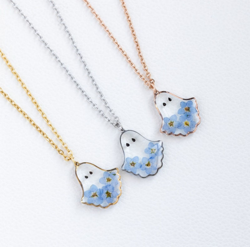 Nouveau Forget Me Not Fleur Fantôme Collier À La Main Véritable Fleur Résine Collier Fantôme Charme Collier Halloween Cadeau Elle