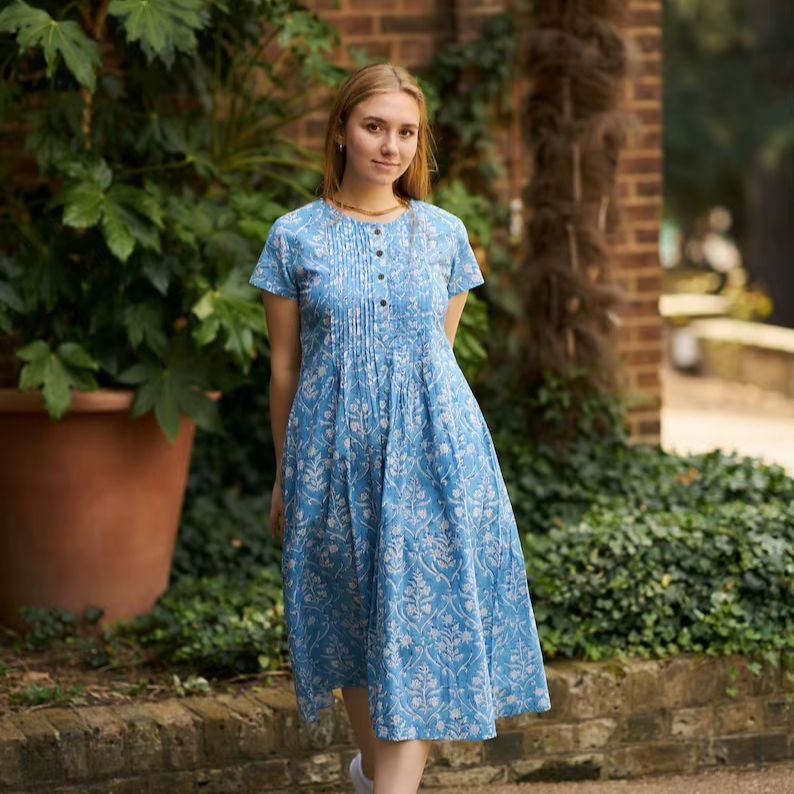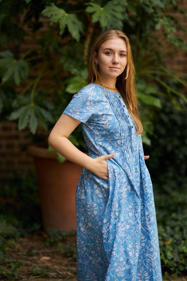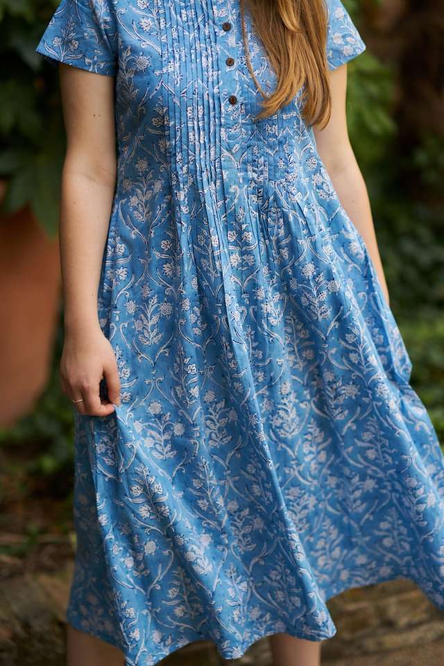 New Ganga Bohemian Dress Pure Cotton Hand Block Printed Blue White Floral | Handmade Ethical Summer Casual Fashion