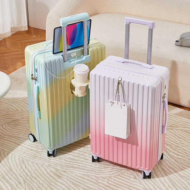 Nouvelle valise trolley pour femme de 20 pouces avec port de charge USB, porte-gobelet, roues pivotantes et fermeture éclair antivol