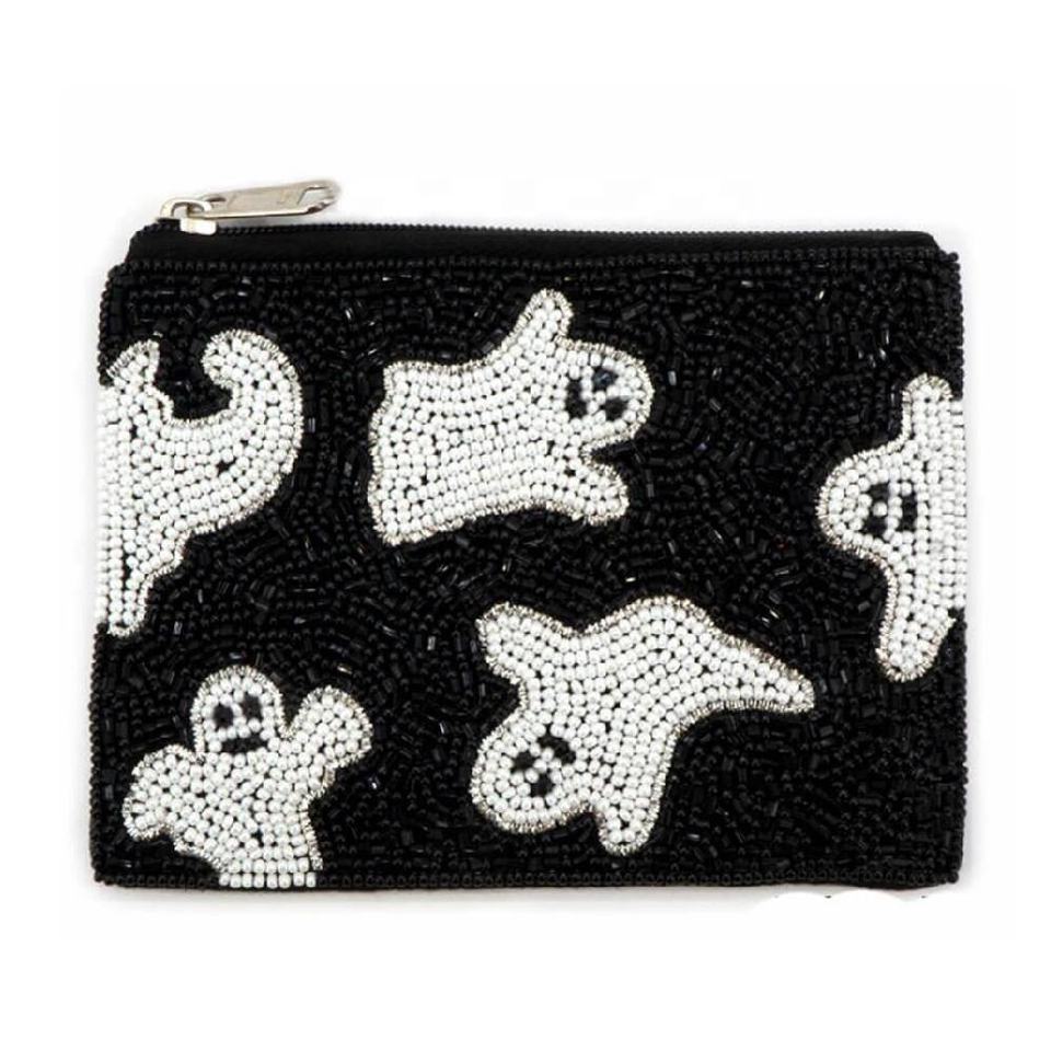 Nouvelle pochette à monnaie perlée avec motif fantôme d'Halloween, fermeture éclair, broderie, petite bourse à monnaie pour clés, argent liquide, cartes, multi-usages