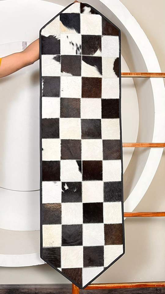 Nouveau chemin de table en cuir de vachette véritable fait main, patchwork à carreaux noir et blanc, style western, décoration d'intérieur, tapis de table à manger