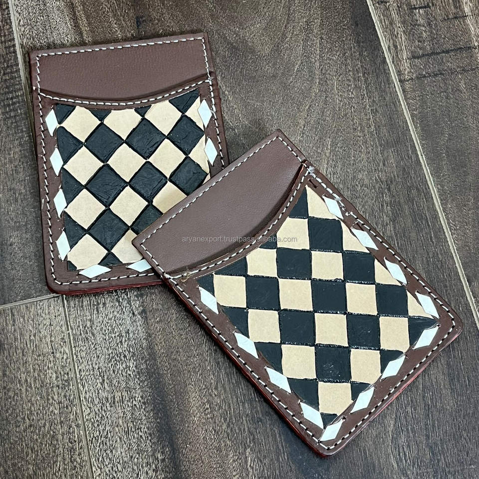Hand Tooled Checkered Leather Credit Card Holder Wallet