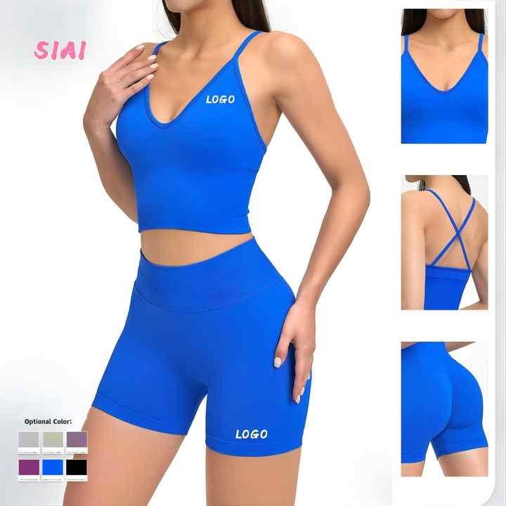 Nouvel ensemble de yoga 2 pièces pour femmes, de haute qualité, sans couture, avec soutien-gorge de sport à col en V et short de gym froncé aux fesses