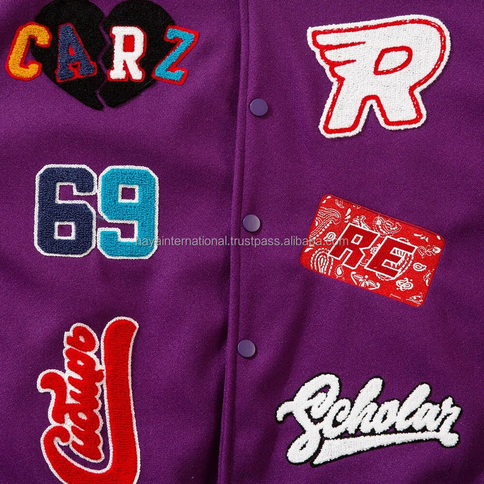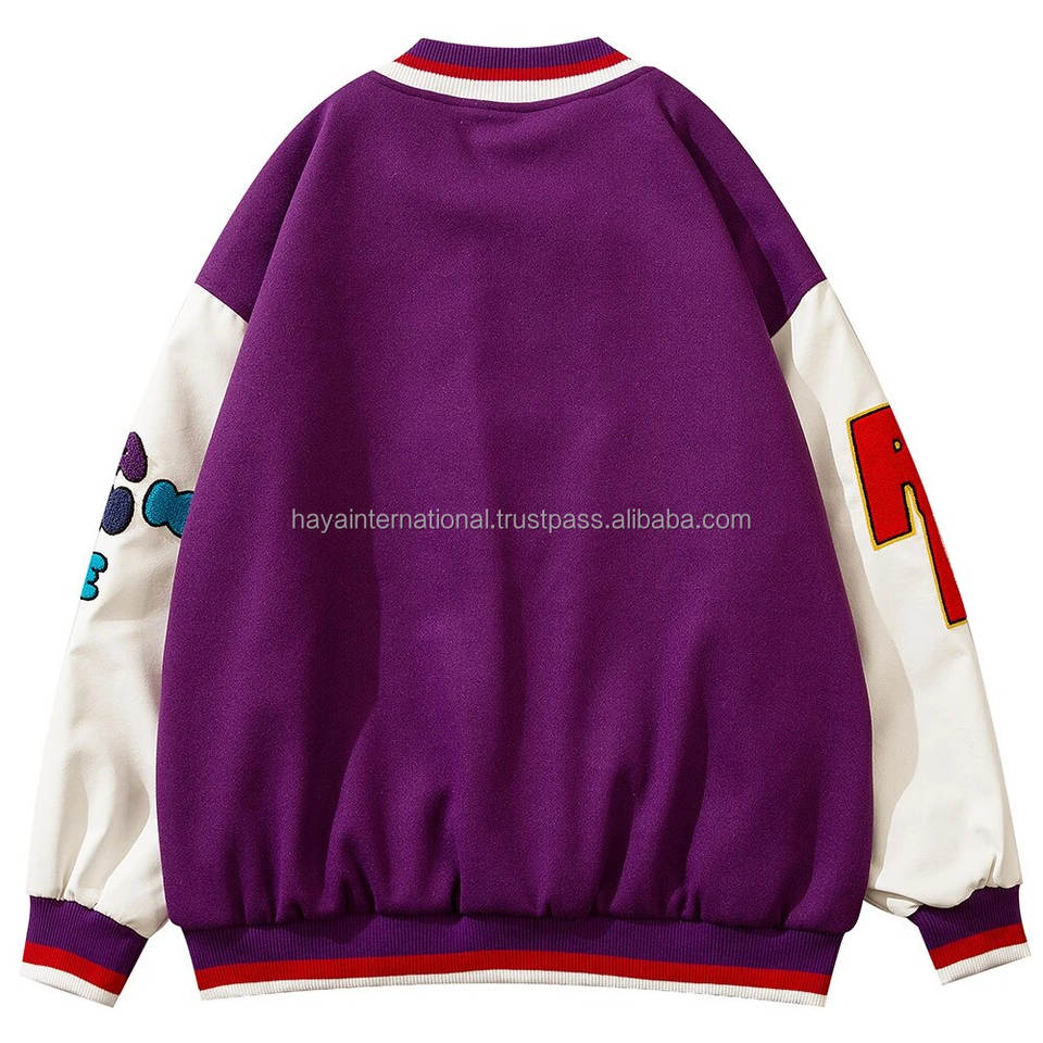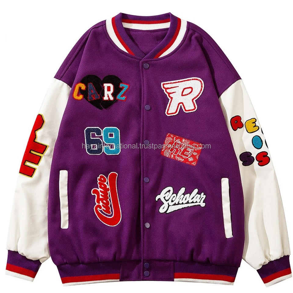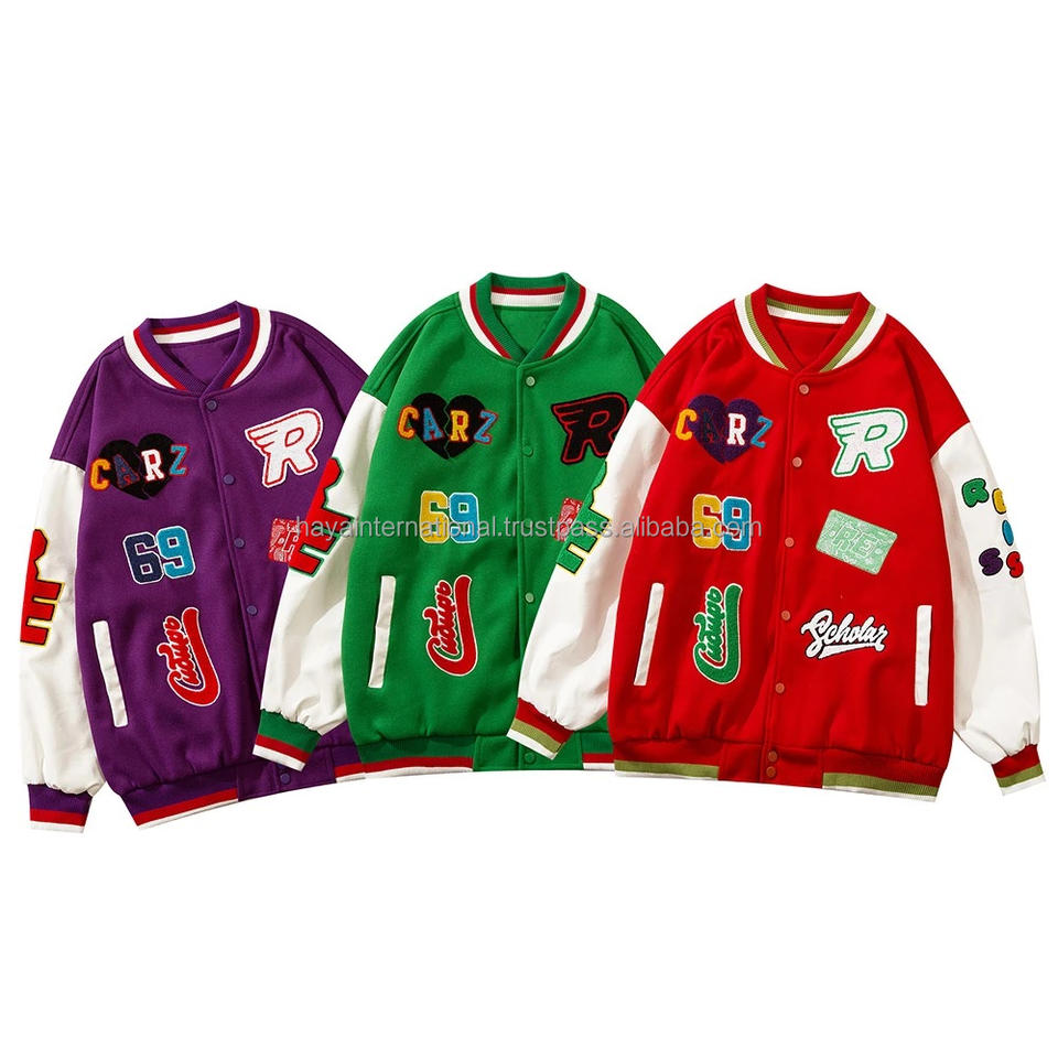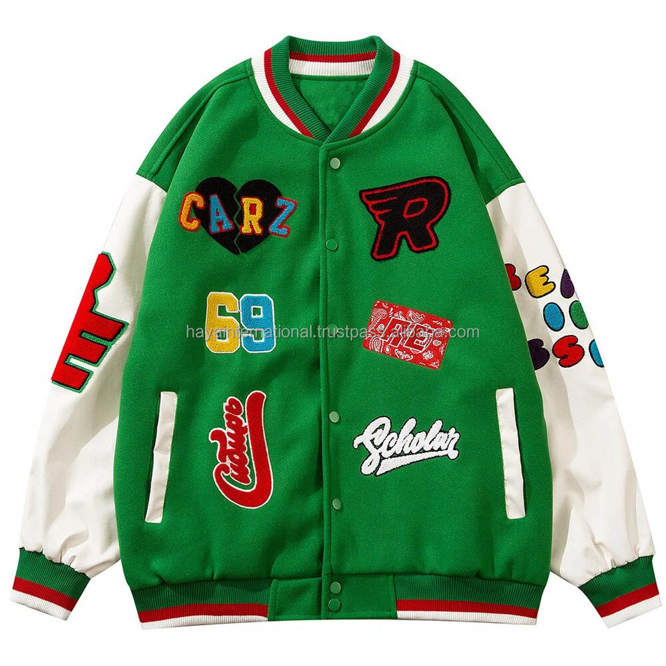 Nouvelle veste universitaire tendance à la vente chaude, broderie en chenille personnalisée, couleurs vibrantes, corps en laine, manches en cuir, design tendance, écologique
