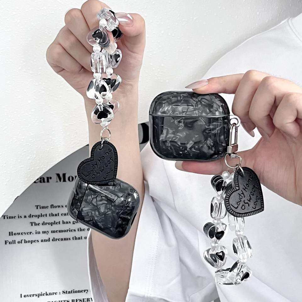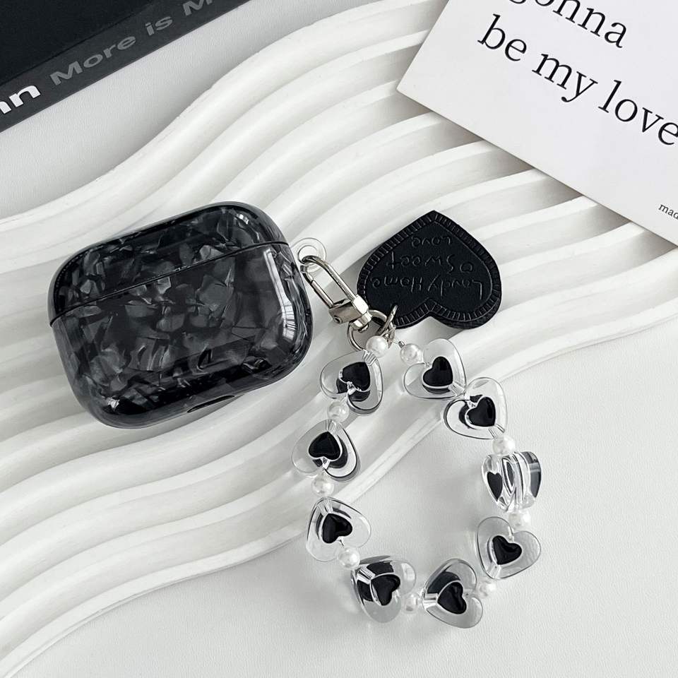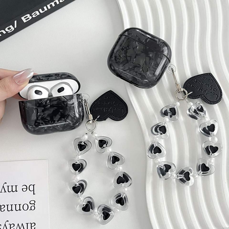 Nouvelle coque souple IMD noire à motif compatible avec les AirPods 4, Pro 2, avec cordon en forme de cœur