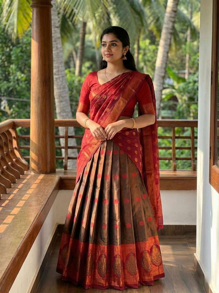 New Indian Ethnic Stylish Kanjeevaram Silk Half Lehenga Saree with Pure Zari Wear for Women Clothing In-Stock