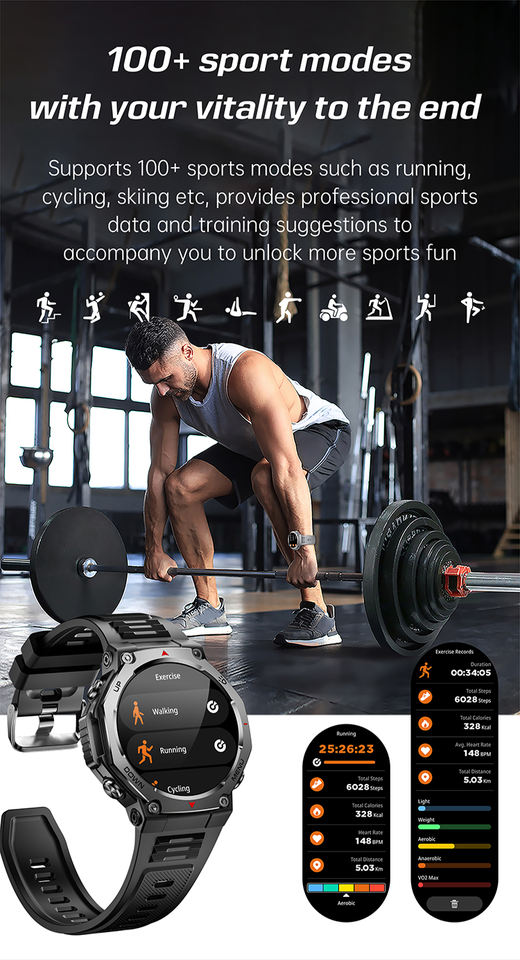 Nouvelle montre connectée Android KT85, écran AMOLED de 1,43 pouce, bracelet en silicone, charge magnétique, lampe torche LED, étanche IP68 pour l'extérieur