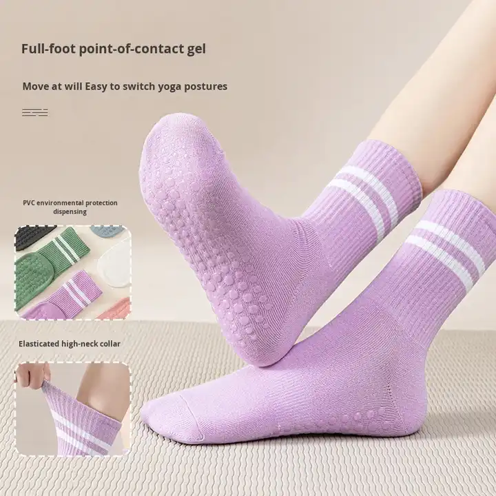 Nouvelles chaussettes de sport en tricot à double barre, mi-mollet, antidérapantes, en caoutchouc et polyester pour femmes, yoga, pilates, usage intérieur