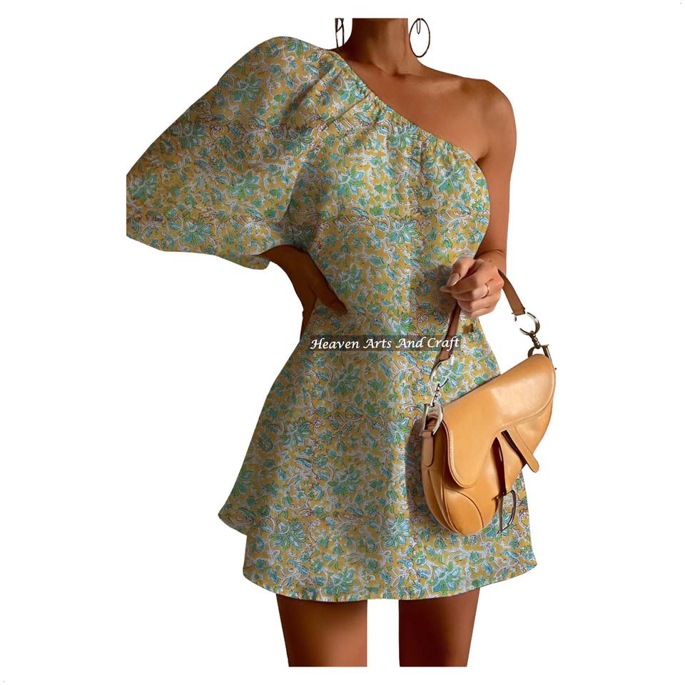 Nom:Robe asymétrique à une épaule avec manches bouffantes en tissu imprimé 100% coton