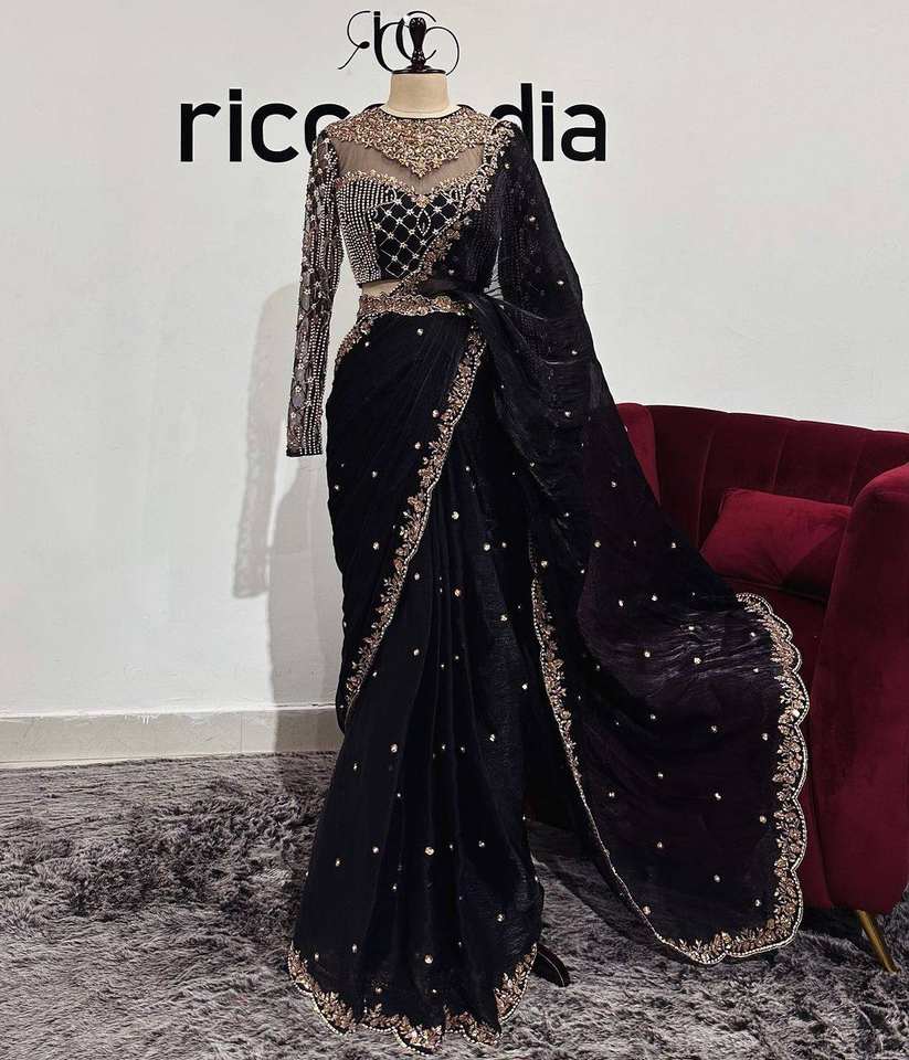Georgette en mousseline de soie de nouveau lancement avec de belles pierres à la frontière et un sari de travail coupé pour les femmes