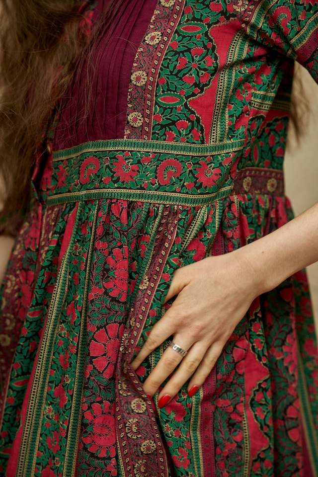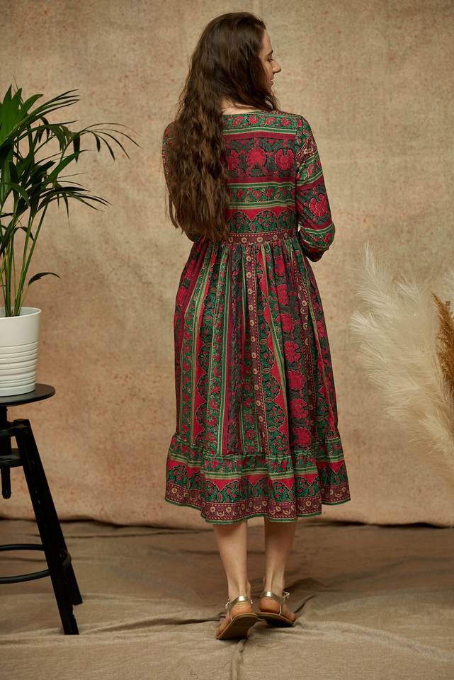 New Lilarani Bohemian Dress Pure Cotton Hand Block Printed Floral Design Handcrafted Ethical Fashion Pink And Green Casual
