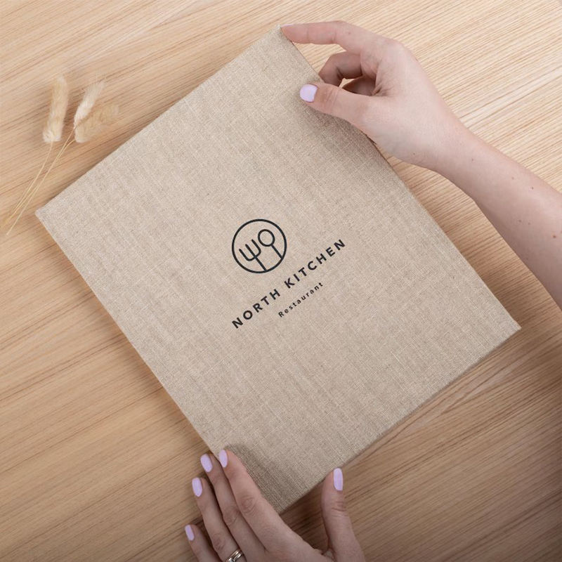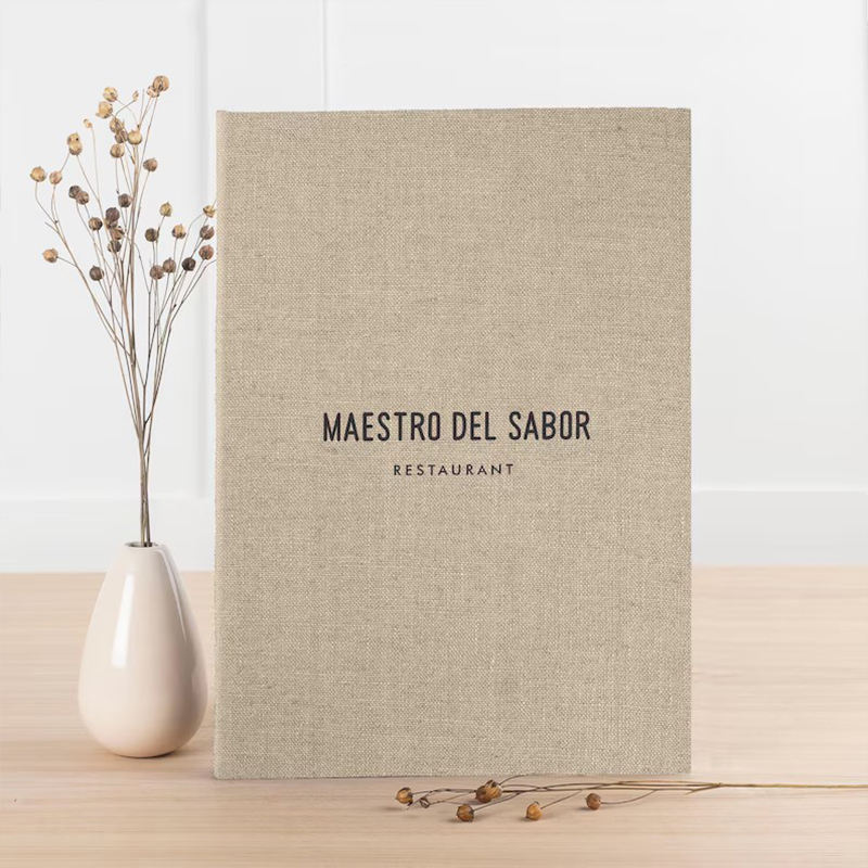 Nouveau porte-menu en tissu avec texture de lin, reliure lâche, pliage fixe, pour restaurant, bar, traiteur, menu personnalisé avec logo estampé or
