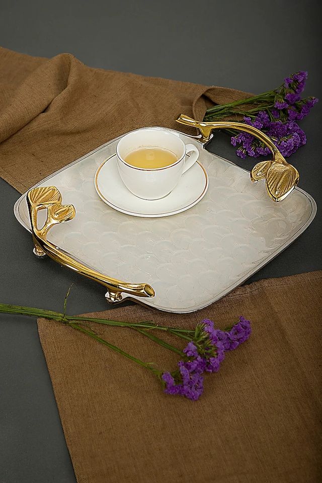 Plateau en aluminium fait main au nouveau style, plaqué nickel avec poignée plaquée or, plateau de service pour hôtel et fêtes