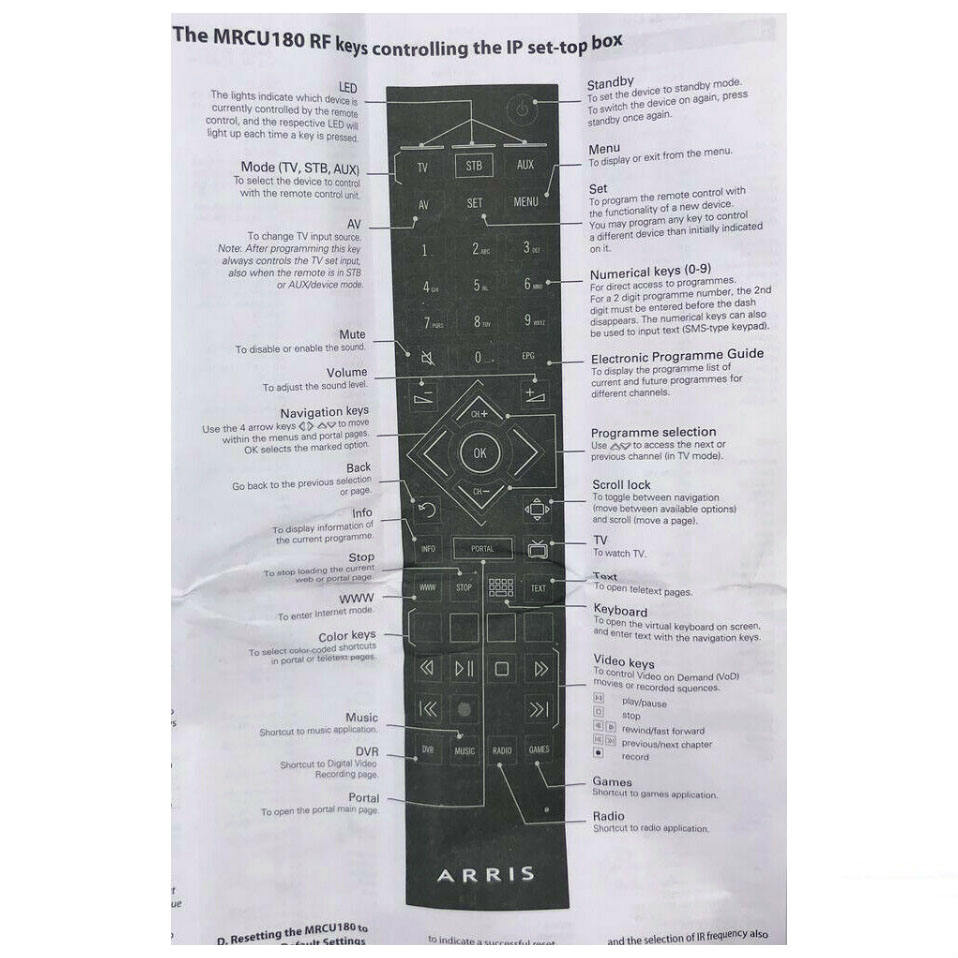 Nouvelle télécommande MRCU180 pour décodeur IP ARRIS RF avec guide utilisateur