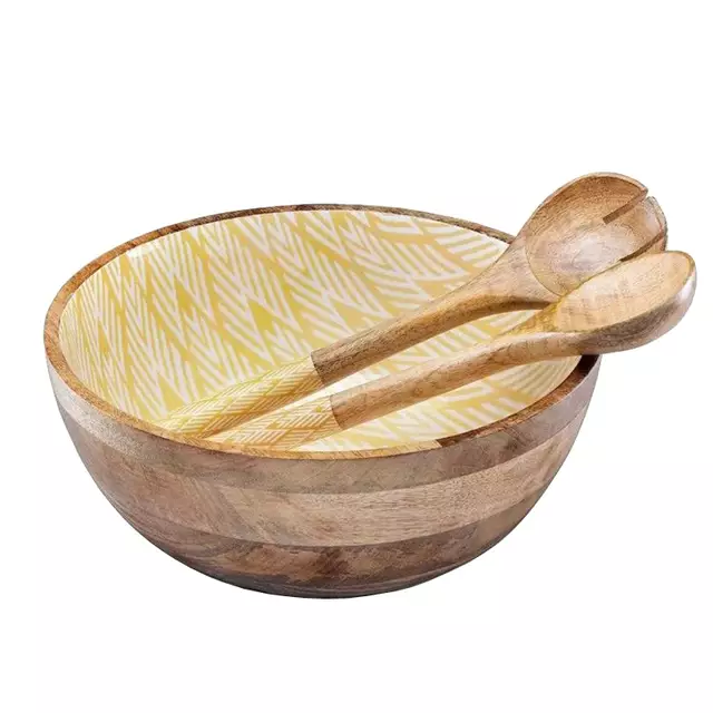 Nouveau bois de mangue/acacia 100% bol à salade rond naturel bois sur peinture émail avec ensemble de serveur fabriqué en Inde bois de manguier avec écorce
