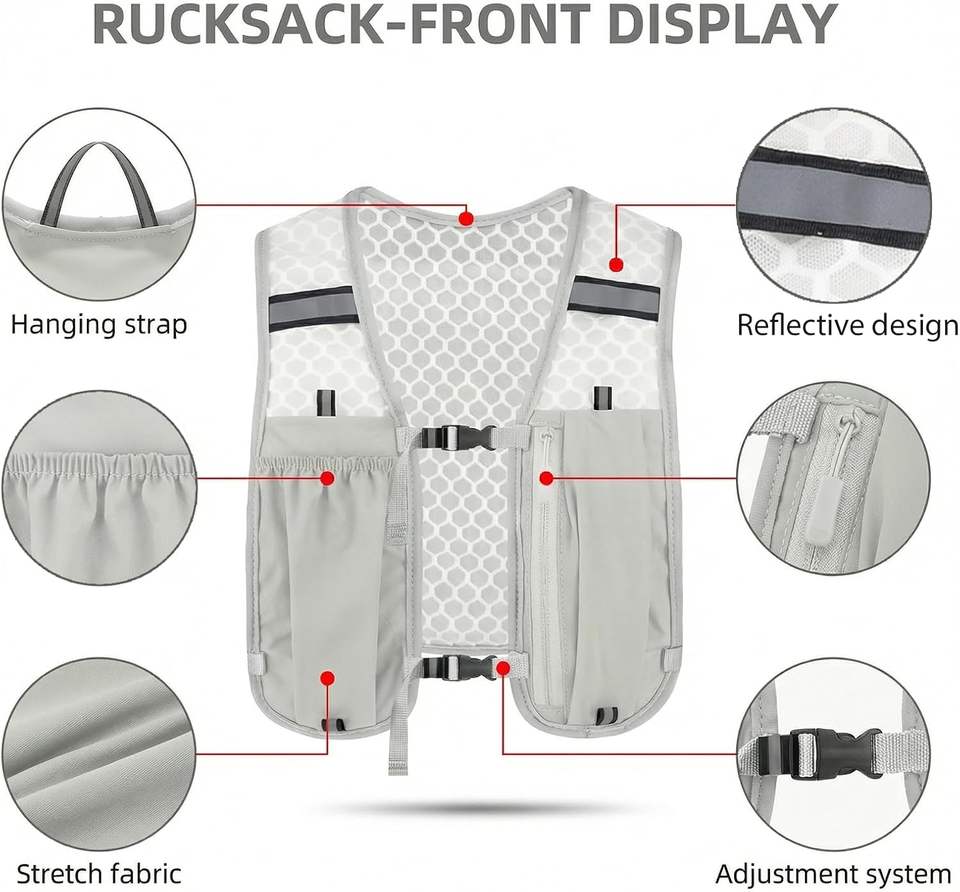Nouveau Gilet de Course Extérieur pour Homme avec Compartiment pour Bouteille d'Eau, Léger, en Nylon, Gris/Noir, Réfléchissant, Sac de Poitrine d'Hydratation pour le Camping