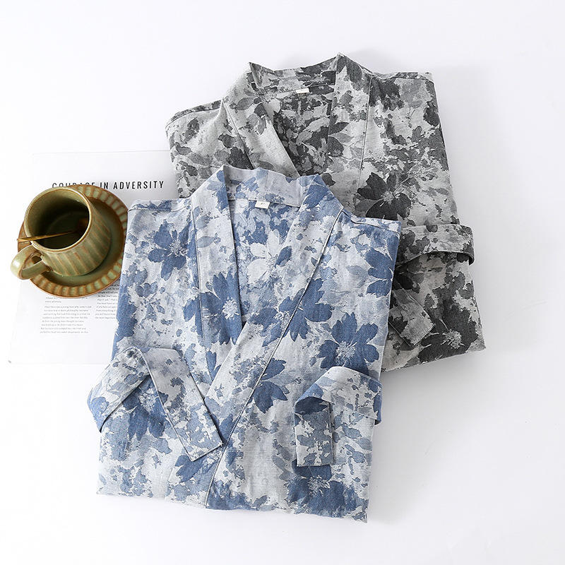 Nouvelle robe de nuit ample en pur coton teint en fil, à lacets, respirante, à motif floral, pour homme, printemps-été-automne, mi-longue, 100 % coton