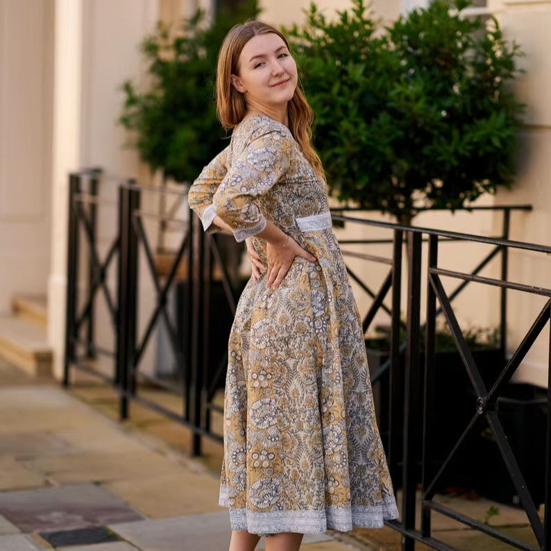New Mimosa Vintage Floral Cotton Hand Block Printed Summer Dress Yellow White Grey Ethical Handmade Natural Fashion