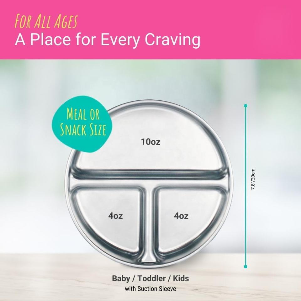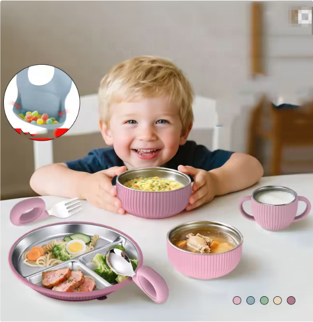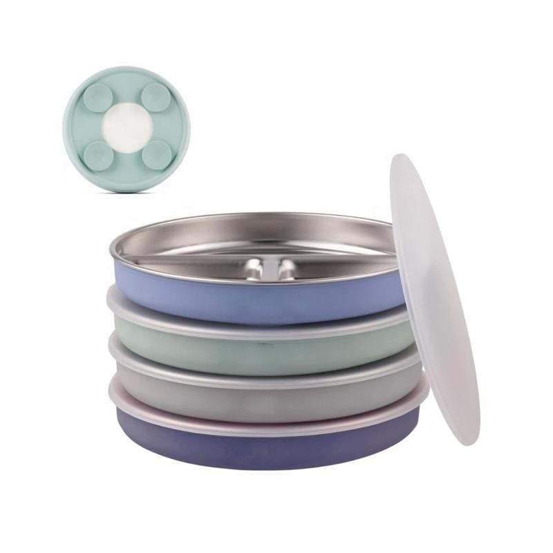 Assiette divisée en acier inoxydable nouveau modèle avec manchon et couvercle en silicone pour bébés et tout-petits, assiette à dîner en silicone inoxydable personnalisée