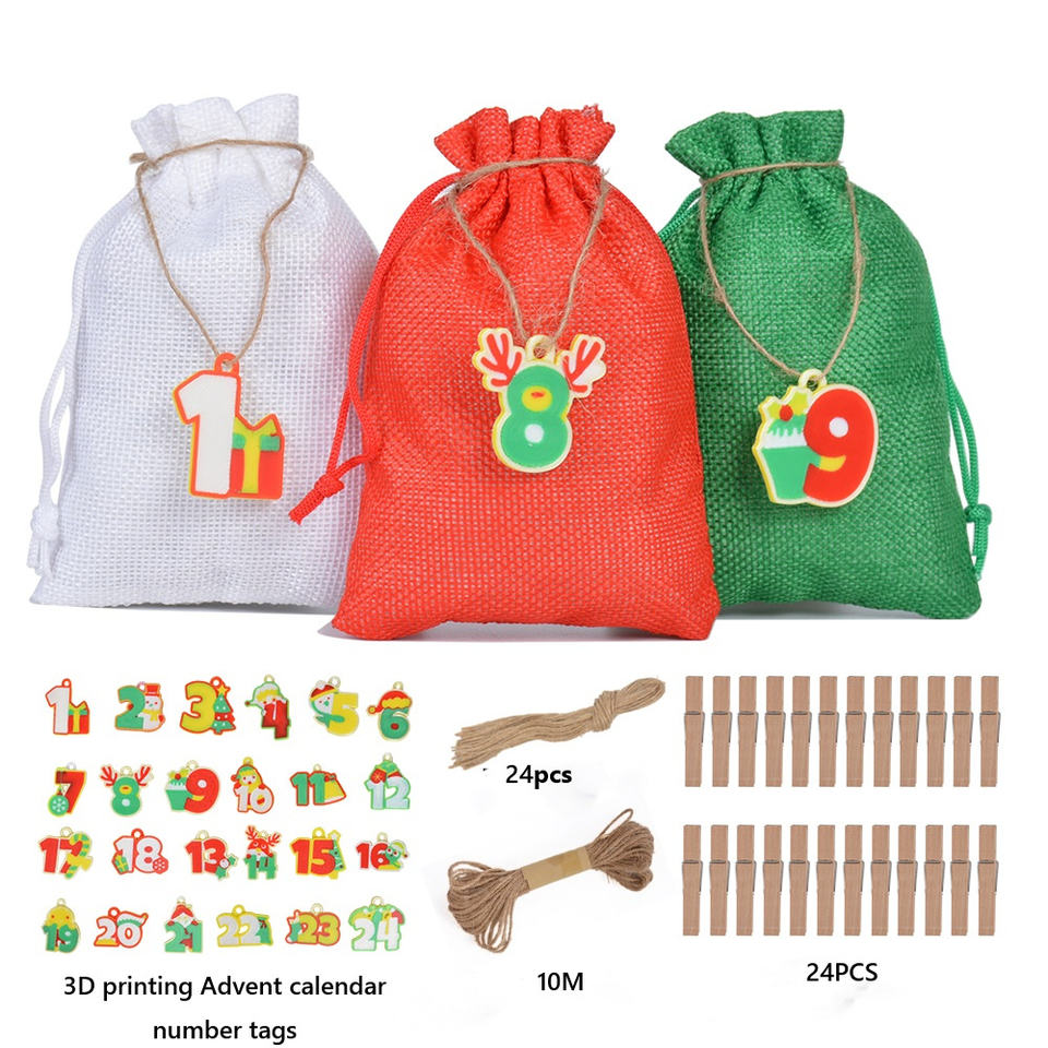 Nouveau calendrier de l'avent numérique imprimé en 3D écologique moderne, sac cadeau en lin 10x14cm YW pour un usage domestique, bonbons pour enfants