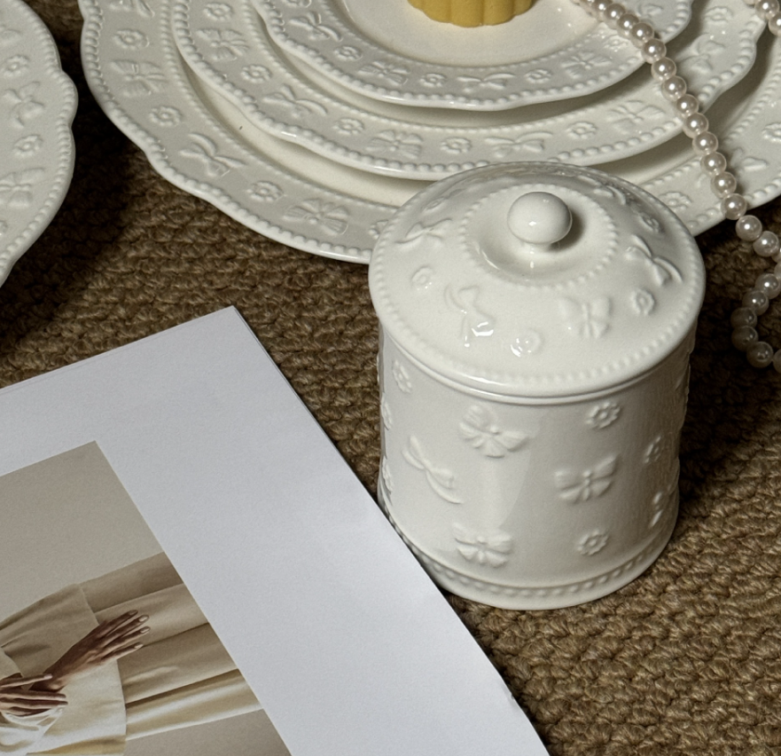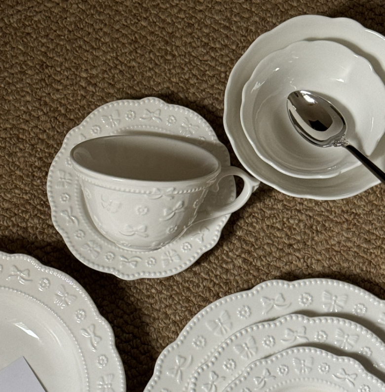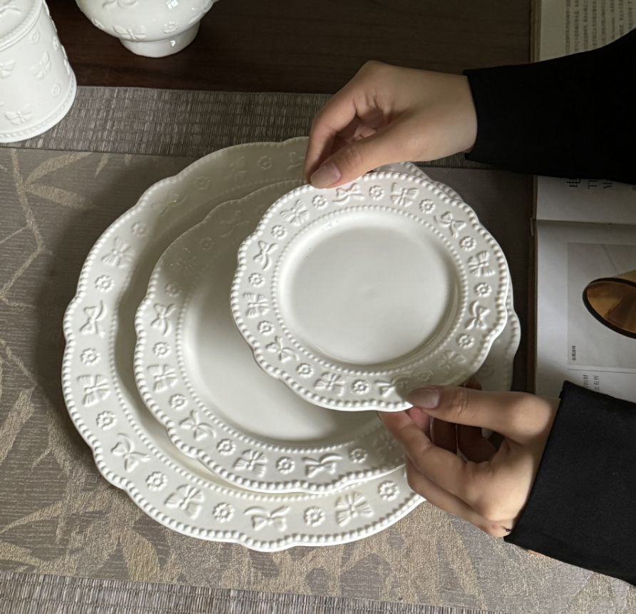 Nouvel ensemble de vaisselle moderne en porcelaine émaillée gaufrée, réutilisable et durable, motif floral avec nœud papillon pour assiettes à desserts