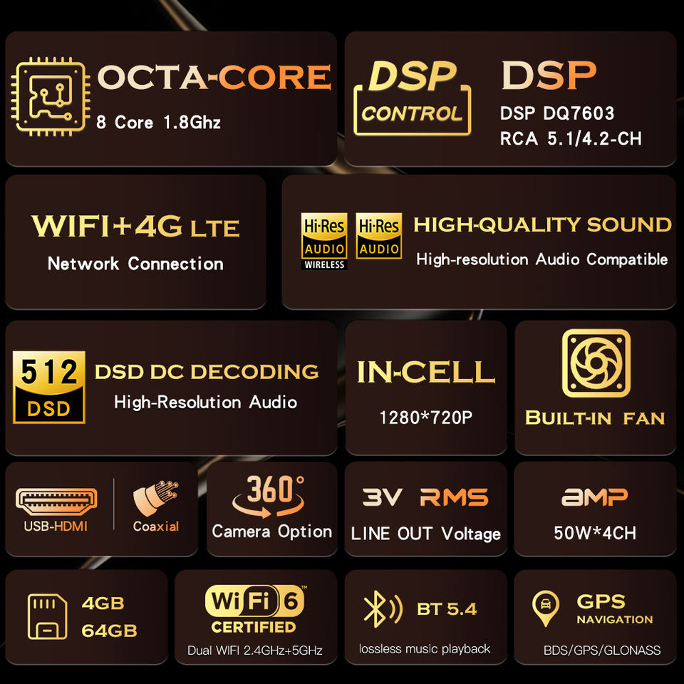 GPS, Stéréo, TPMS, Amplificateur, OBD2, DSP, Haut-parleur intégré, Lien de miroir, Microphone intégré, Écran partagé, Gestionnaire de fichiers, Volant de voiture de Contrôle, CarPlay, Image dans l'image, Hi-Res Audio