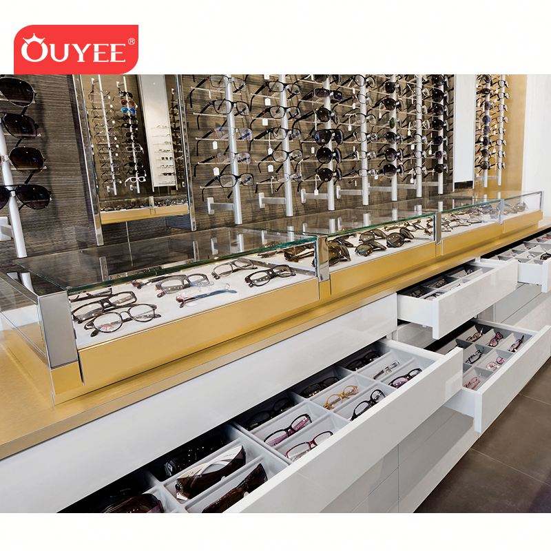 Nouveaux meubles de magasin optique Unité murale Comptoir de magasin Conception Présentoir mural pour lunettes Vitrines optiques avec tige d'affichage