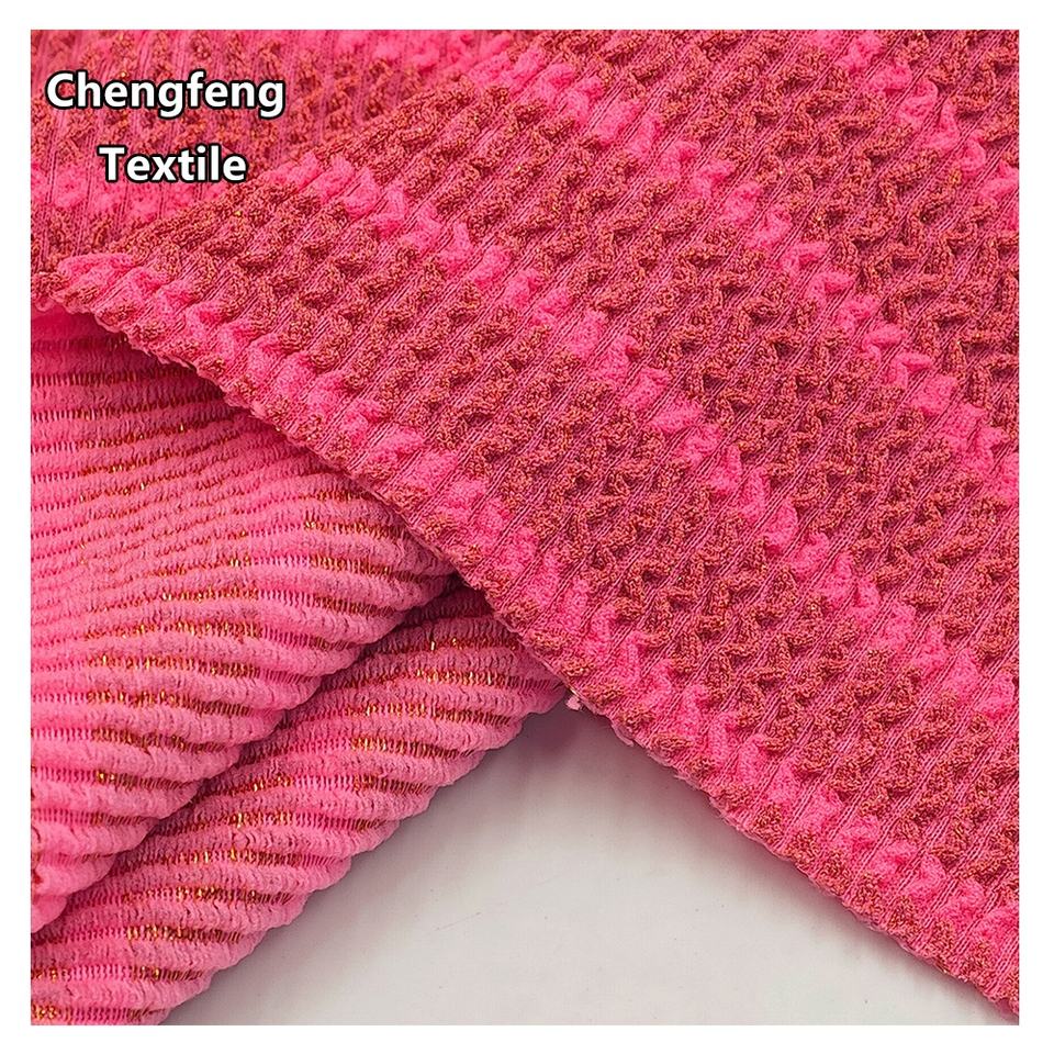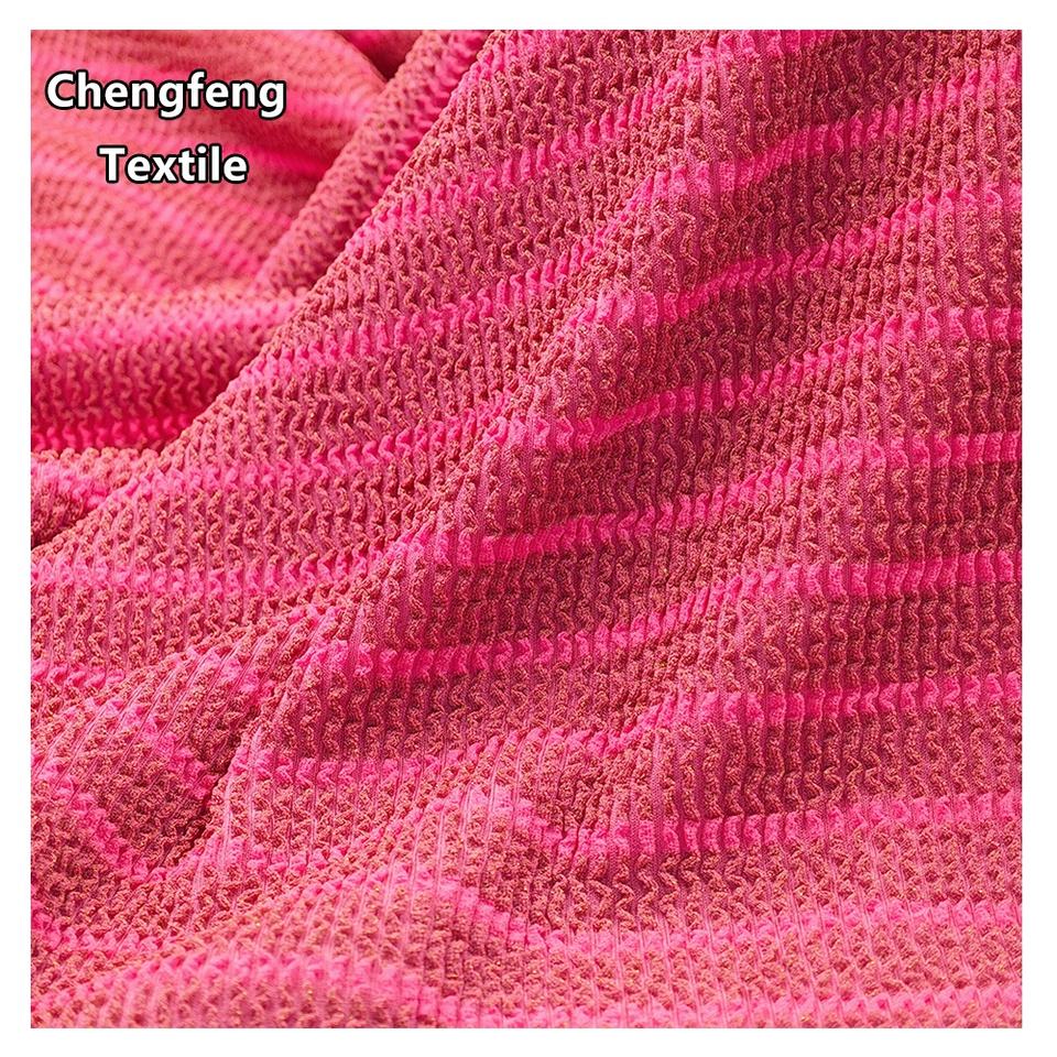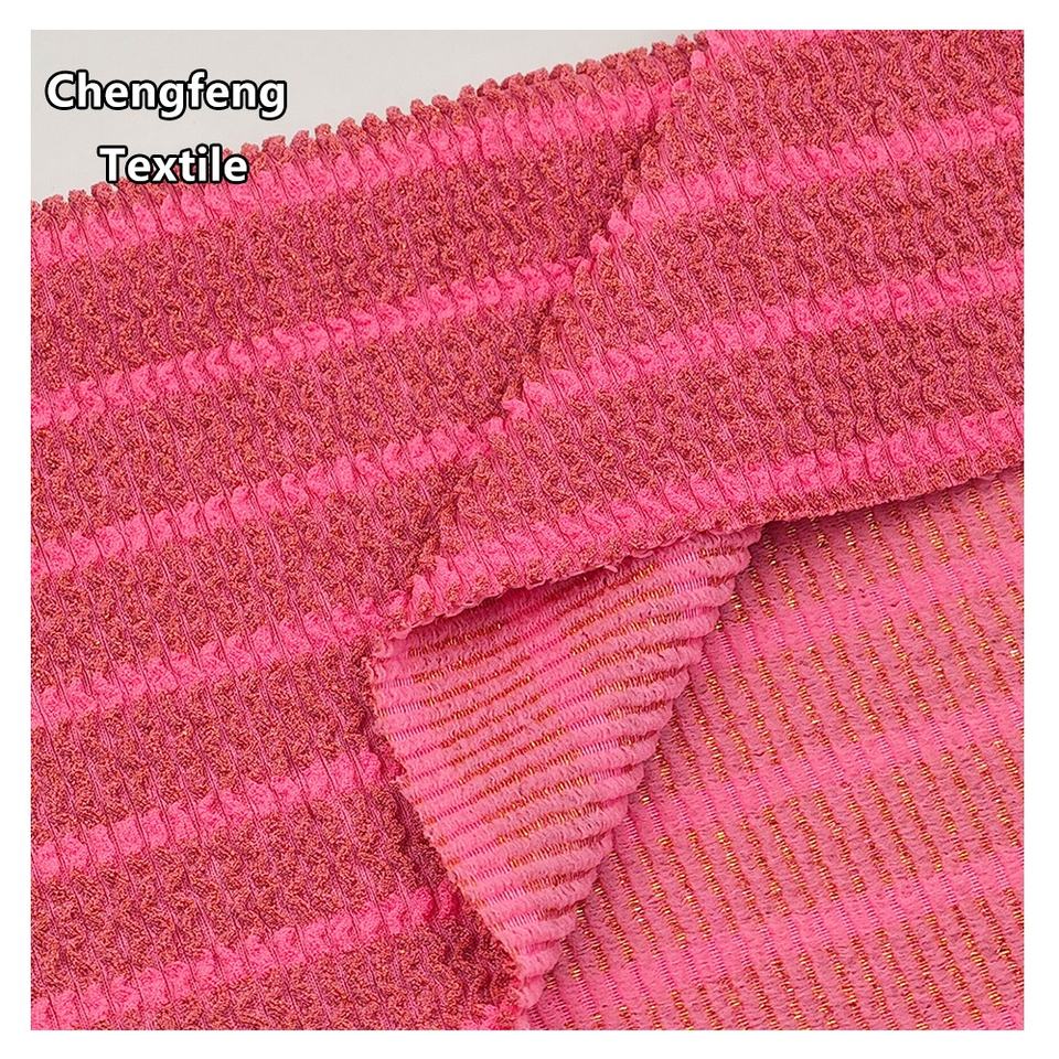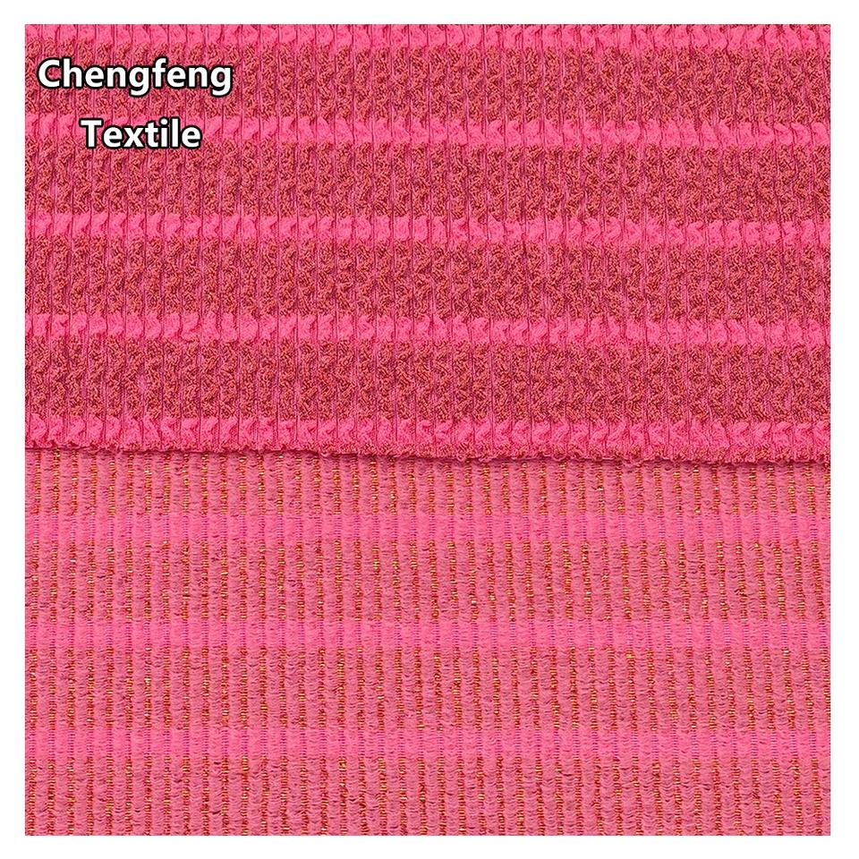 Nouveau tissu extensible en jacquard plissé à rayures dorées, 330 GSM, polyester-spandex, tricoté pour la confection de robes et de maillots de bain pour femmes