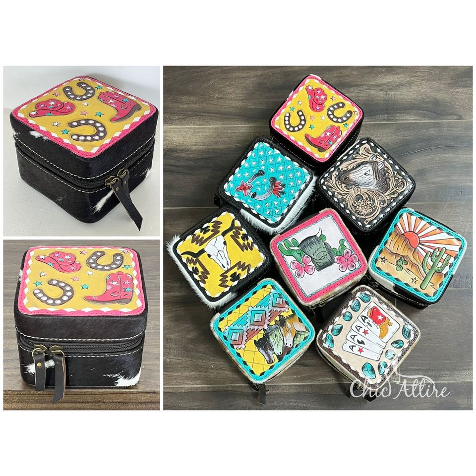 Boîte de rangement pour bijoux en cuir de vachette peint à la main
